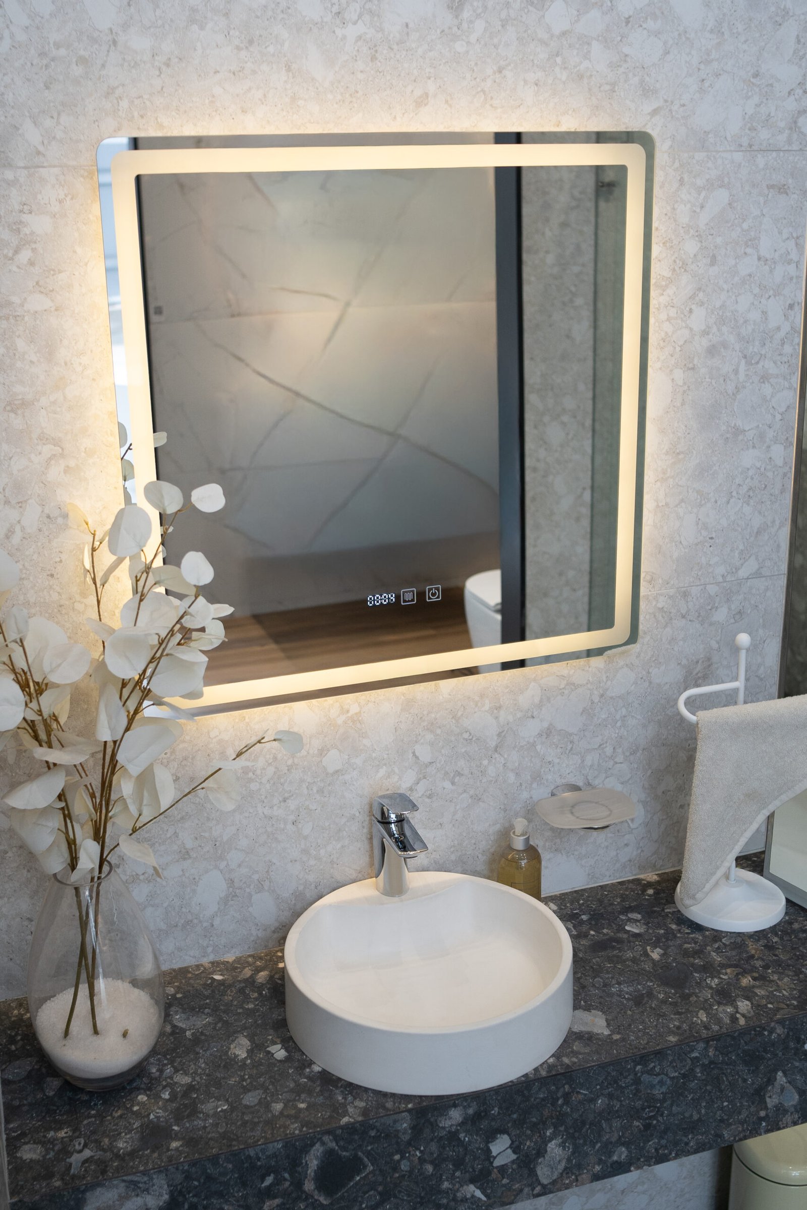 Todos los espejos Qualika permiten cambiar entre: – Luz fría (blanco puro, ideal para maquillaje) – Luz neutra – Luz cálida (amarilla suave, más relajante) Además, se puede regular la intensidad de la luz